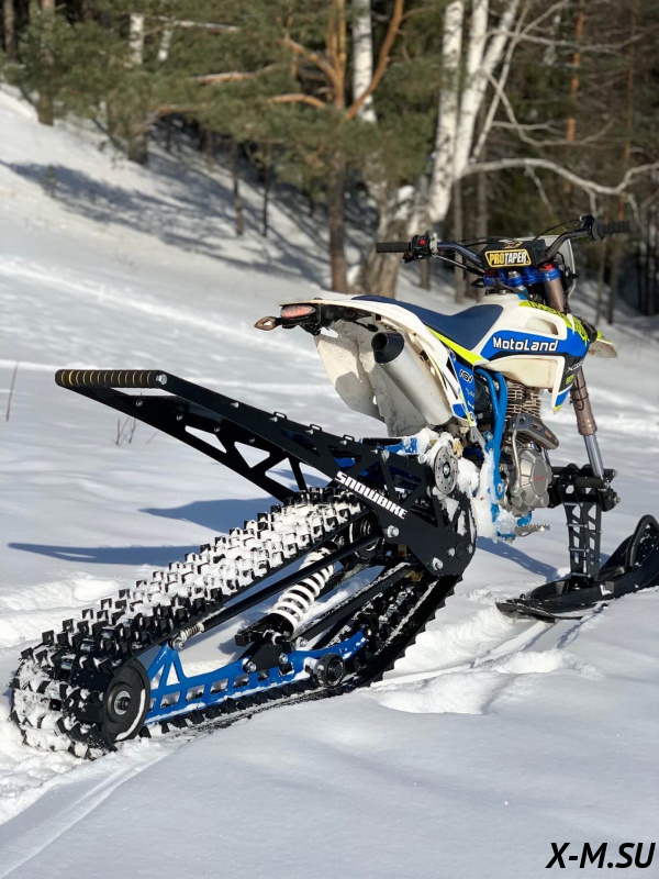 Folk 121 от Snowbike — универсальный гусеничный комплект для внедорожных мотоциклов. Гусеничный мотоцикл (СНОУБАЙК) это, по сути, одноколейный снегоход. Вы получаете возможность продлить мото сезон и эксплуатировать мотоцикл не только летом но и зимой.